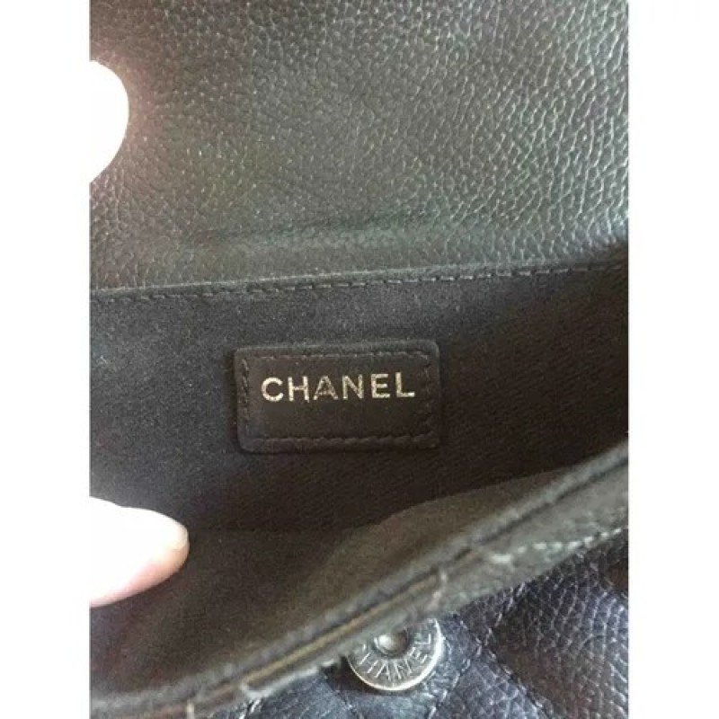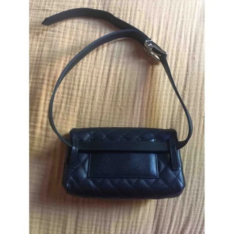 Chanel 黑色粒面小牛皮腰包。