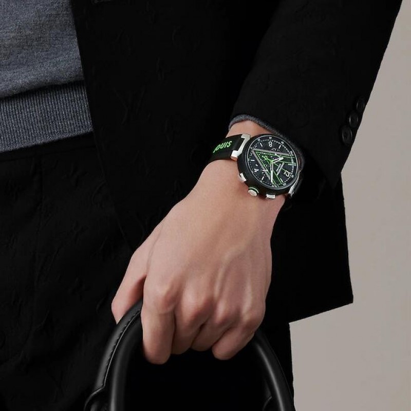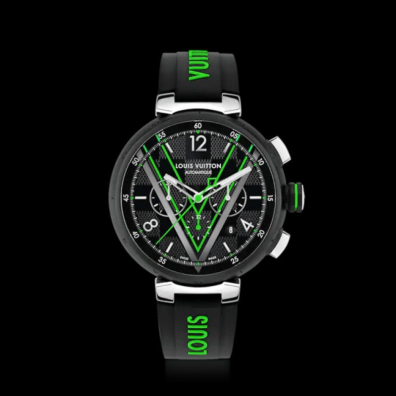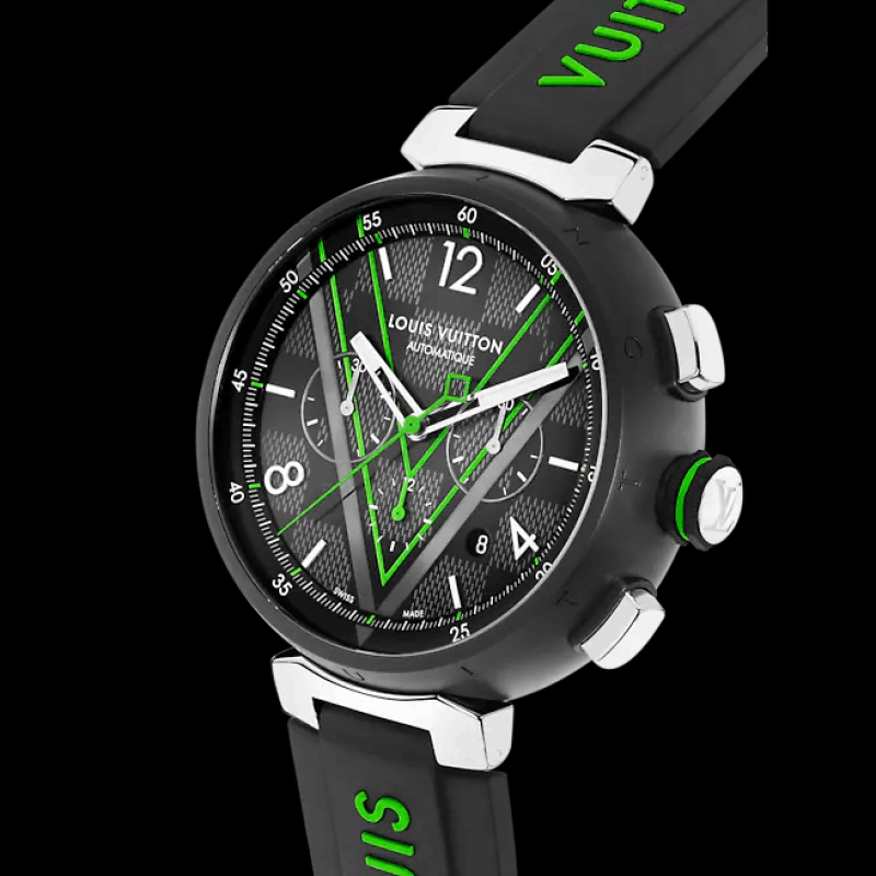 這款路易威登全新的經典Tambour腕錶取材自品牌經典的Damier Graphite帆布,非常適合打造休閒運動造型。腕錶綴有Gaston-Louis Vuitton的V字標誌,為整個錶盤增添精緻現代氣息。腕錶配備計時器功能,鮮明清新的風格完美呼應Virgil Abloh系列,飾以黑色、銀色和綠色,締造奪目對比效果。