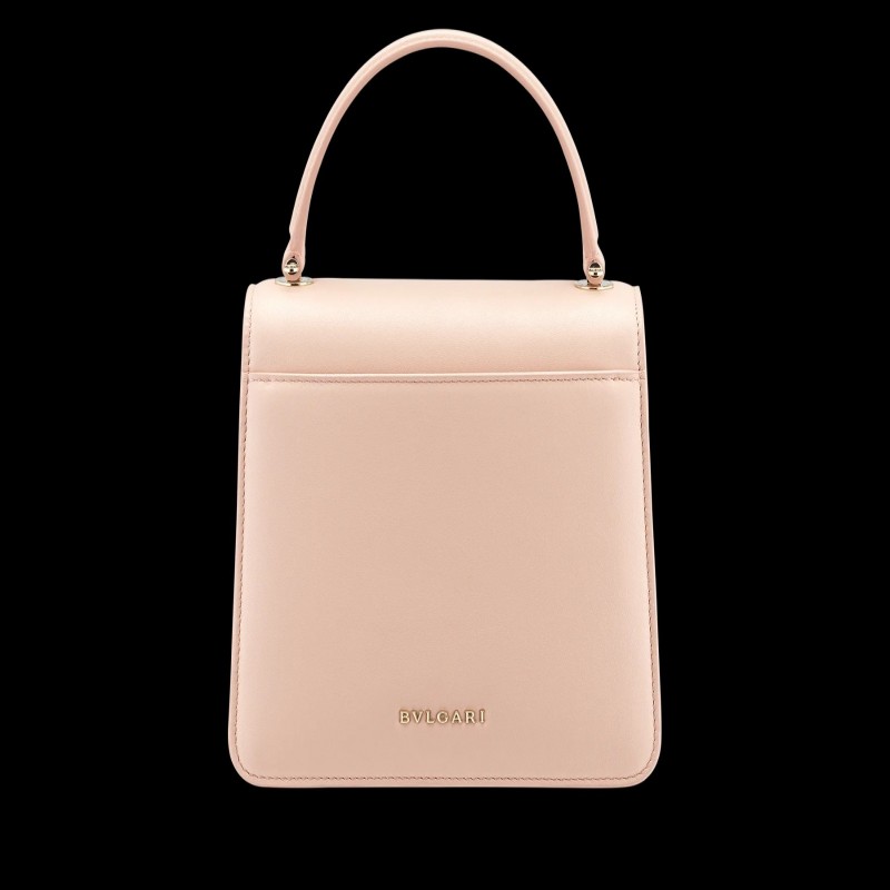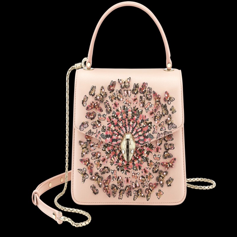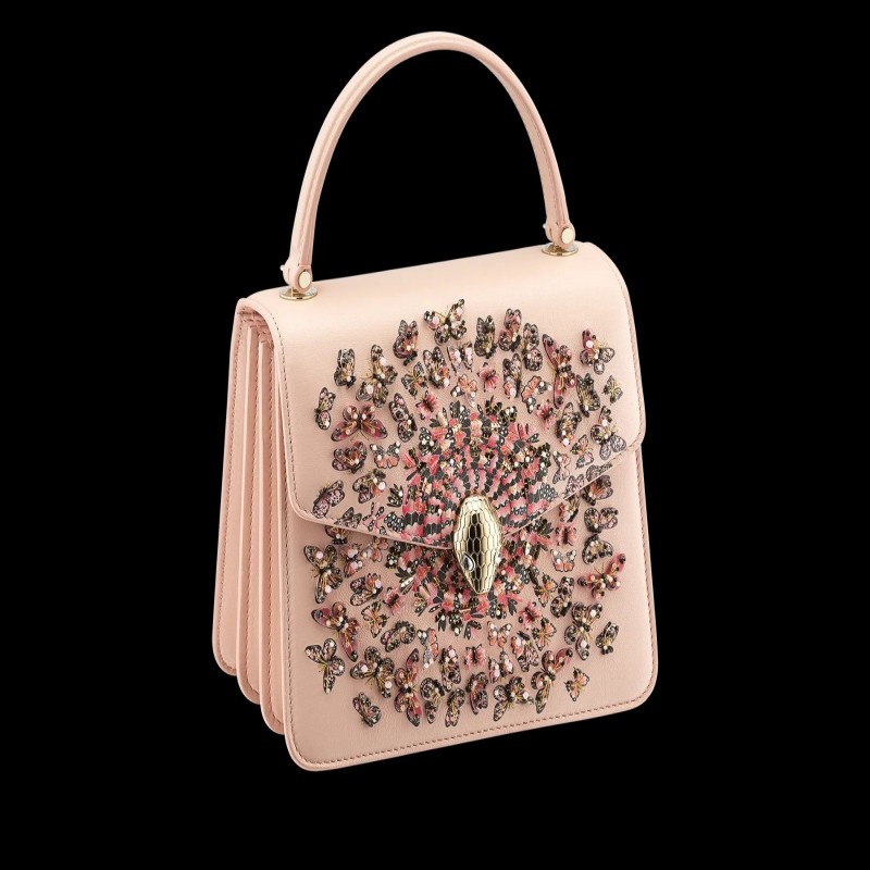 “Mary Katrantzou x Bvlgari”水晶玫瑰粉色納帕皮革手提包,水晶玫瑰粉色納帕皮革內襯。淺金鍍金黃銅新款 Serpenti 頭部搭扣,飾有迷人水晶眼睛。特別版本。