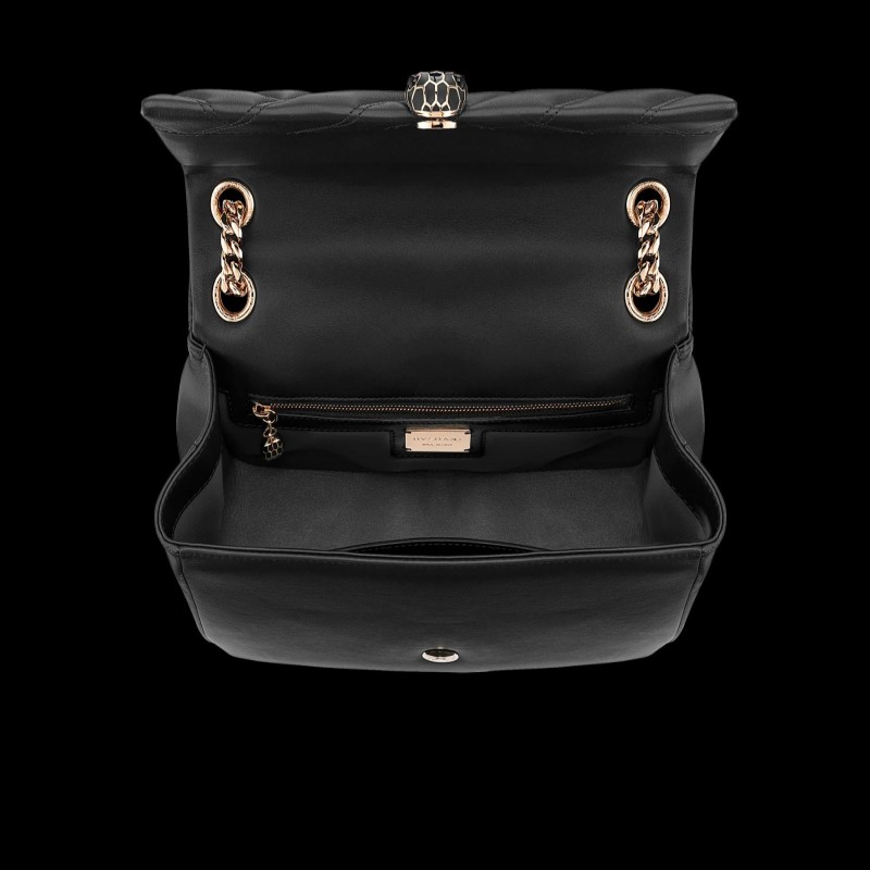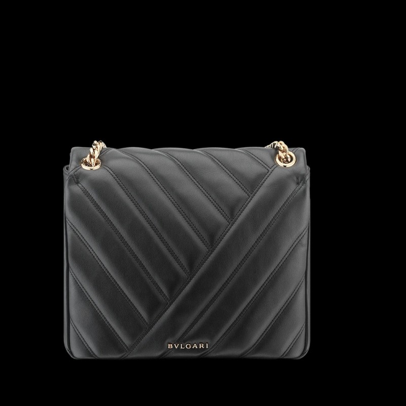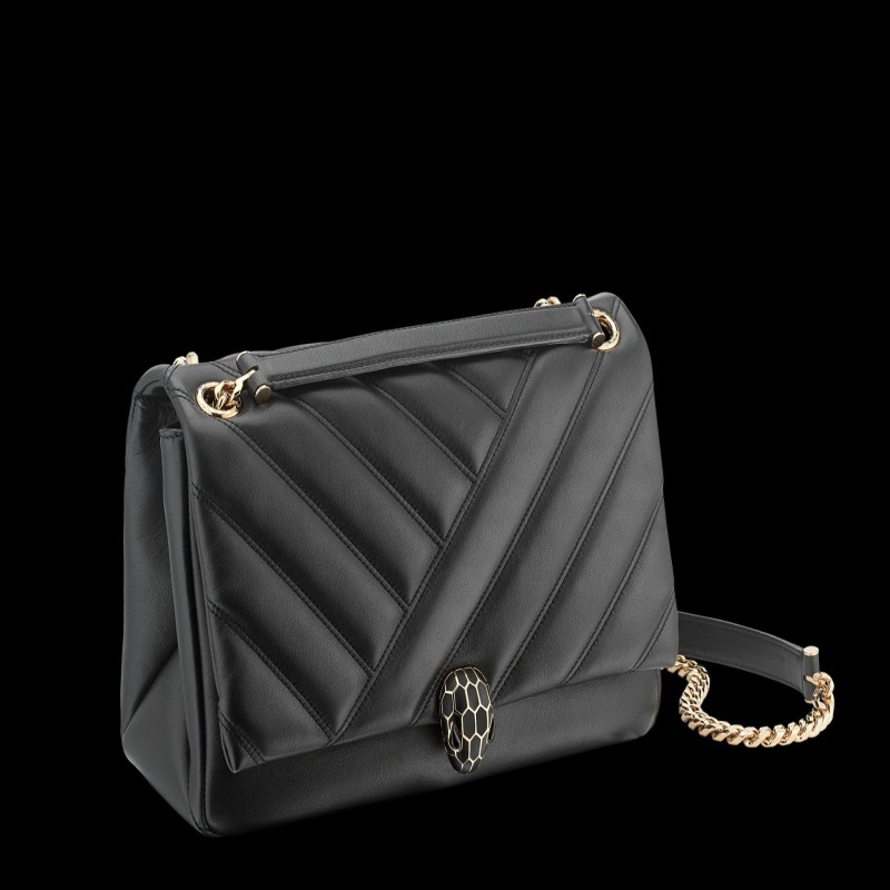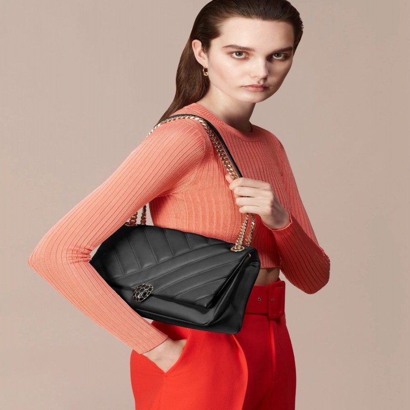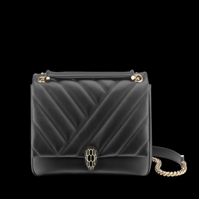 Serpenti Cabochon 單肩包在珠寶般的精緻、低調的誘惑和日常魅力之間取得了完美的平衡,以其柔和的觸感彰顯出精緻的柔軟感,讓人想起寶格麗標誌性寶石切割凸圓形面的光滑表面。柔軟的黑色納帕皮革採用卓越的 matelassé 工藝傳達出立體效果,而鍍玫瑰金黃銅標誌性蛇首搭扣飾有黑色啞光和閃亮琺瑯鱗片,以及黑色縞瑪瑙眼睛。這款包包配有一條粗鍊和兩條舒適的皮革肩帶,非常適合搭配精緻的日裝造型,提供多種佩戴方式。中等尺寸,帶單個角撐板、1 個內部拉鍊口袋、1 個開口口袋和帶有 BVLGARI 標誌的內部金屬標籤完善了該型號。27 x 19 x 11 厘米。- 10.6 x 7.5 x 4.3